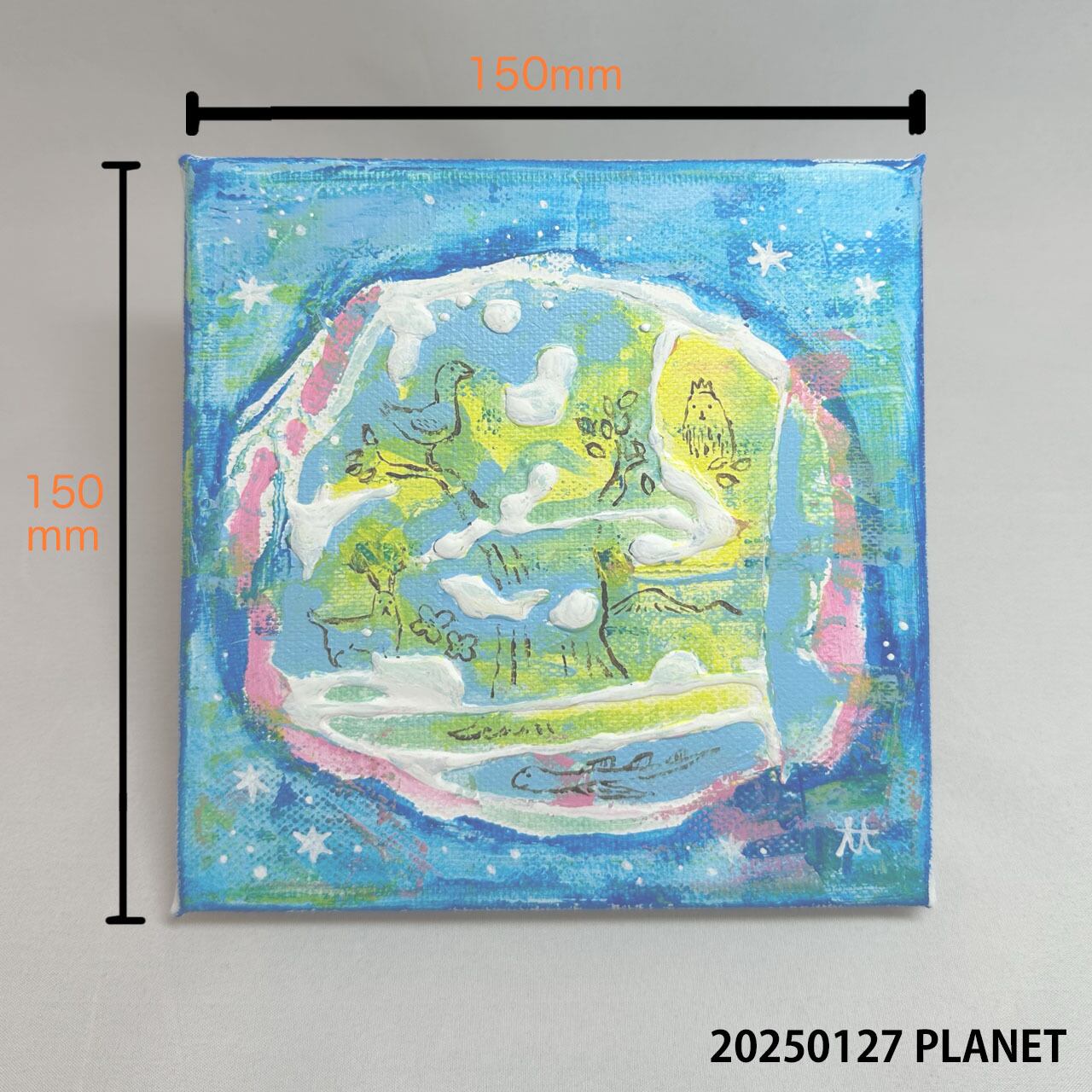 製作:2025年/キャンバス/画材:アクリル絵の具/サイズ:150×150mm。お使いの端末や環境により、写真と実物の色味や質感が多少異なって見えることがあります。